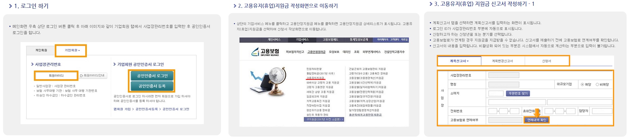①로그인하기-고용유지 지원금 작성 화면 이동-신고서 작성하기