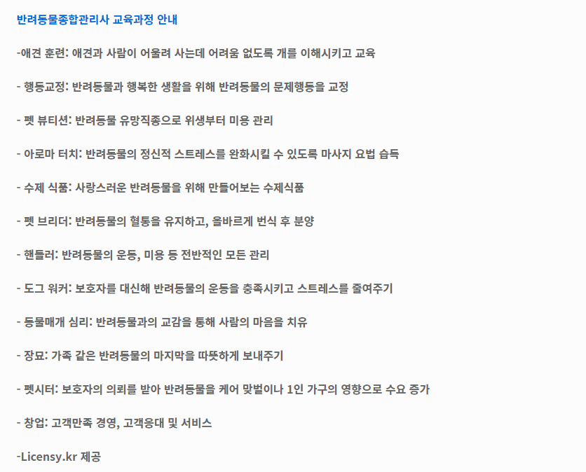 위와 같이 자격증 취득 후 다양한 전문 미용사나 훈련사 펫시터 등 취업 가능하며