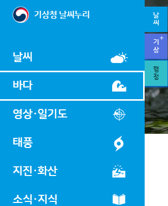 우측에 보시면 날씨, 바다, 태풍 등 다양한 메뉴가 있습니다.