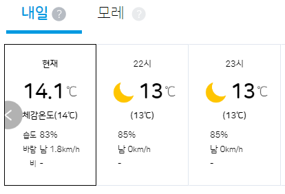 빨간색 사각형을 보시면 오늘, 내일에 대한 체감온도, 강수량, 바람 등의 날씨정보를 제공