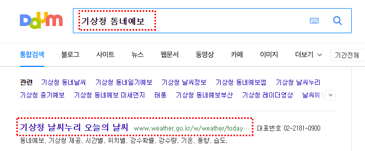다음 검색창에 기상청 동네예보 검색 후 밑에 기상청 날씨 누리 오늘의 날씨를 클릭하시면