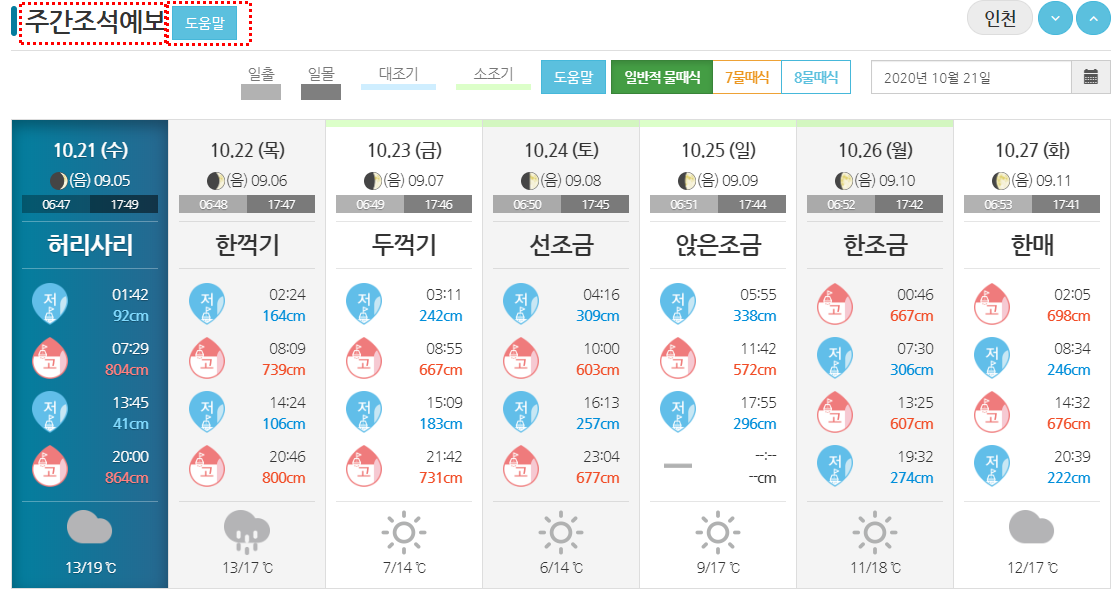 주간 조석예보 허리 사리, 한꺼기, 두꺼기, 대조기 일반적 물때 식 등을 자세히 시각적으로 쉽게
