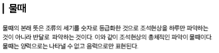 예를 들면 물때의 본래 뜻은 조류의 세기를 숫자로 등급 화한 것으로 조석현상을 하루만이라고 합니다.