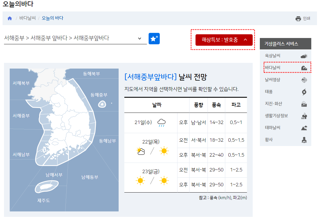 기상청 홈페이지 우측 상단에 보시면 오늘의 바다 날씨가 있는데요 오늘 현재는