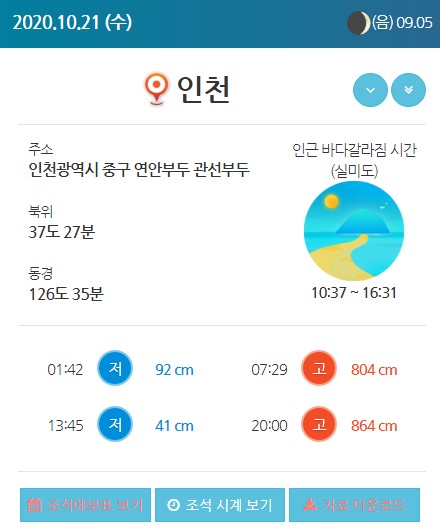 밀물/썰물 정보 클릭하시면 옆에 있는 화면(예시) 인천, 지도에 정보가 나옵니다.