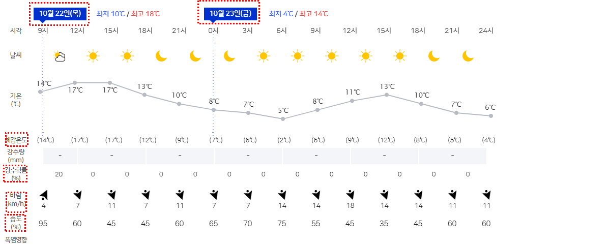 빨간색 사각형을 보시면 오늘, 내일에 대한 체감온도, 강수량, 바람 등의 날씨정보를 제공